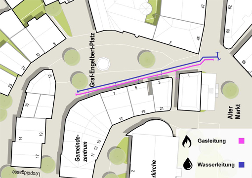 Konkret werden auf einer Länge von rund 100 Metern neue Gas- und Wasserversorgungsleitungen im Bereich des Graf-Engelbert-Platzes (Hausnummer 7) bis zur Ecke Wilhelmstraße (Hausnummer 1) verlegt und anschließend die betroffenen Hausanschlüsse umgebunden.